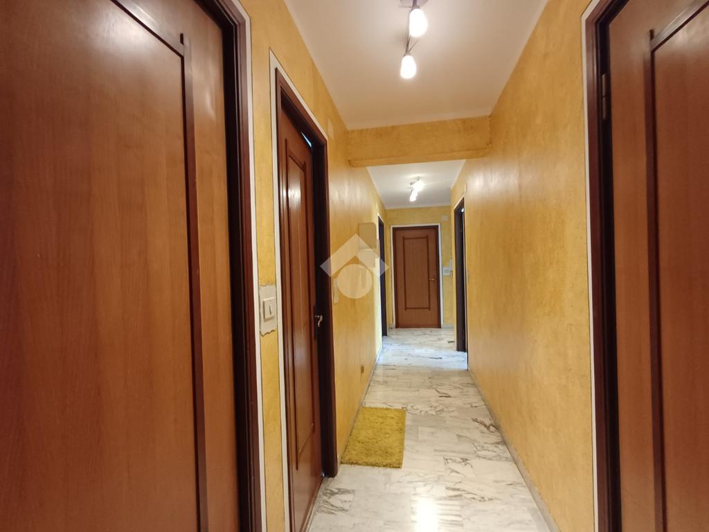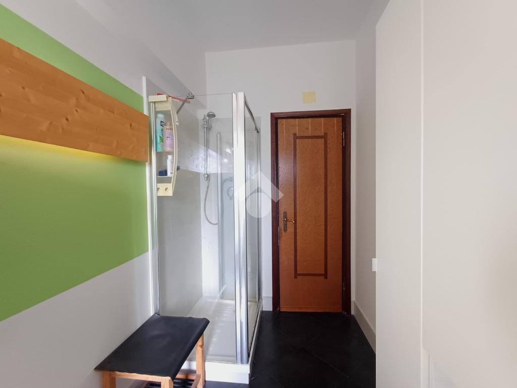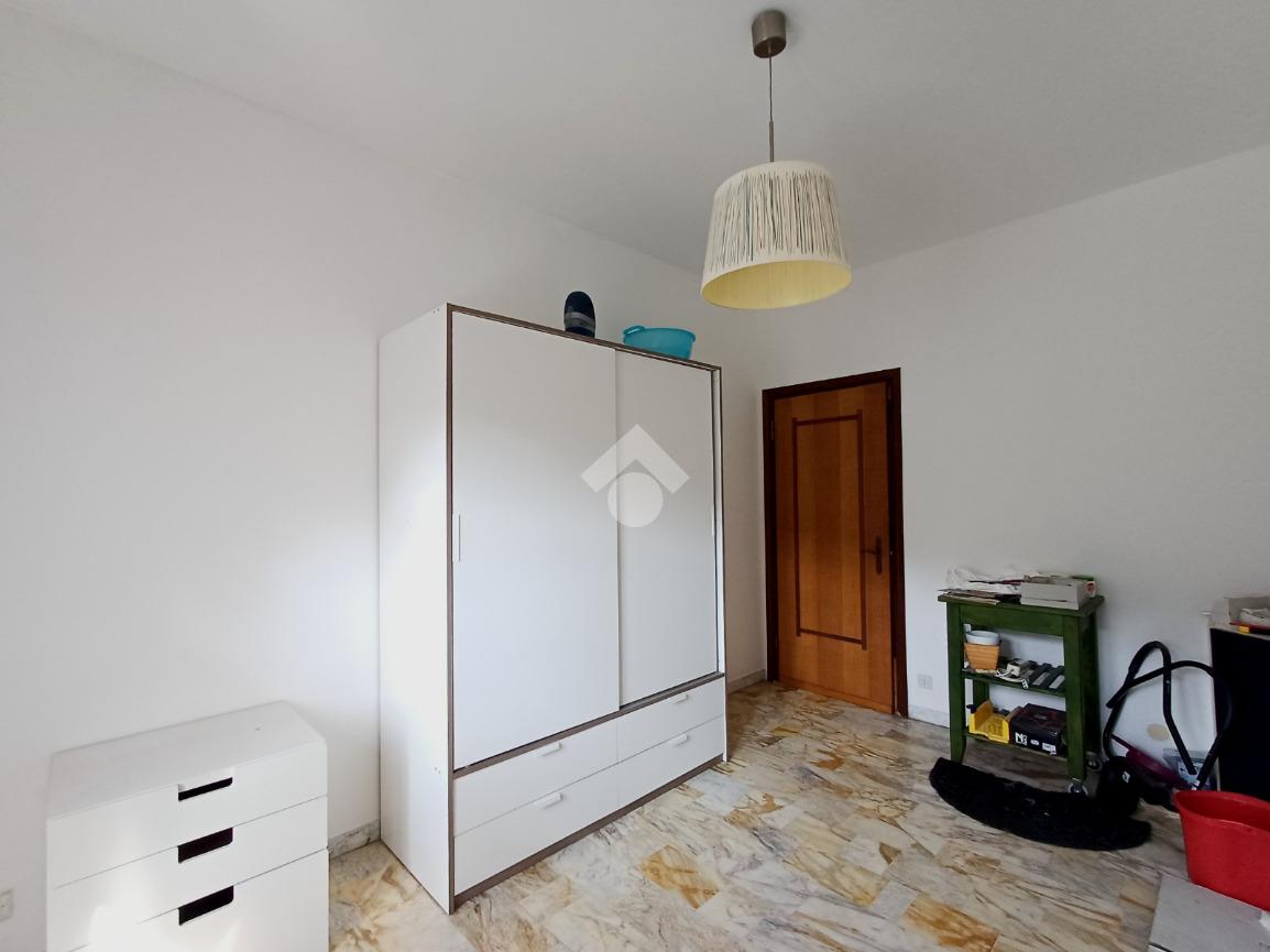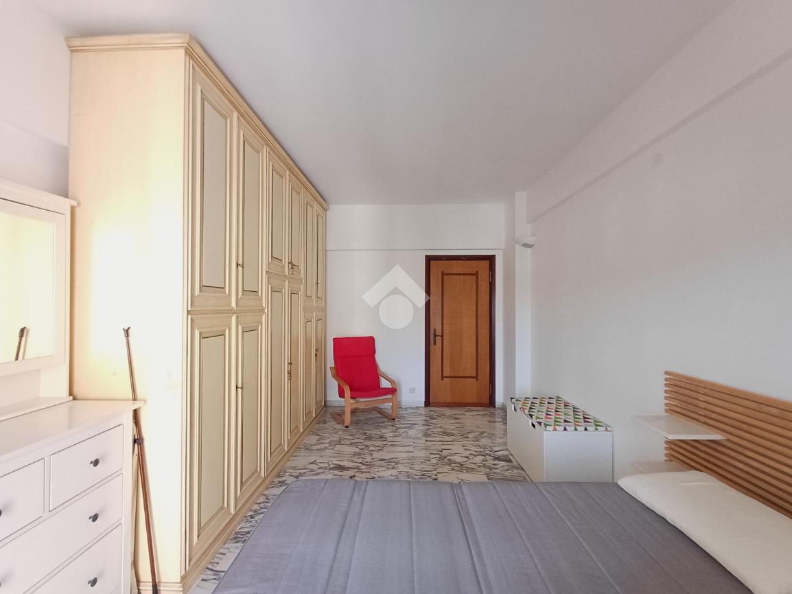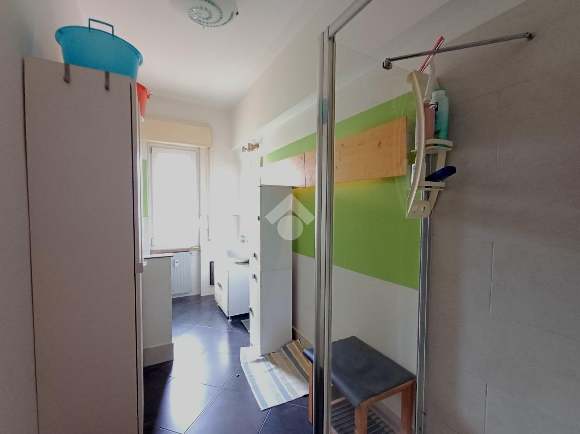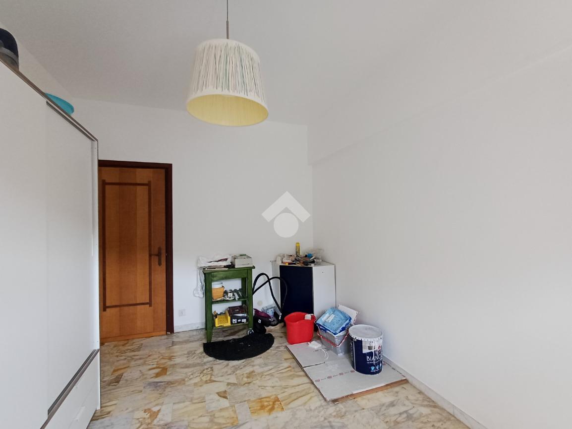Tra due camere è posizionato il bagno dotato di finestra e box doccia. Internamente in buonissime condizioni, l'immobile è dotato di infissi in alluminio doppio vetro e pavimento in parquet nella prima camera matrimoniale e graniglia alla genovese (tipo marmo) nelle altre stanze.
