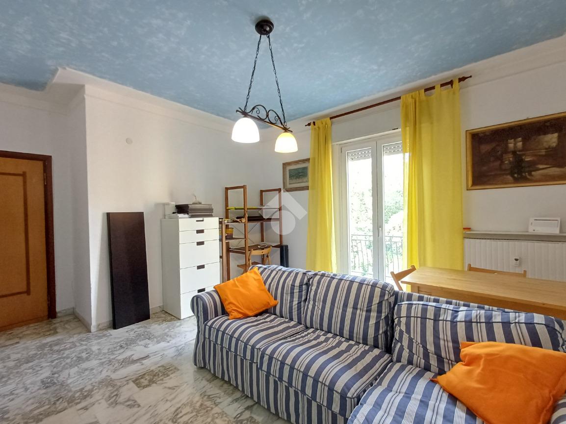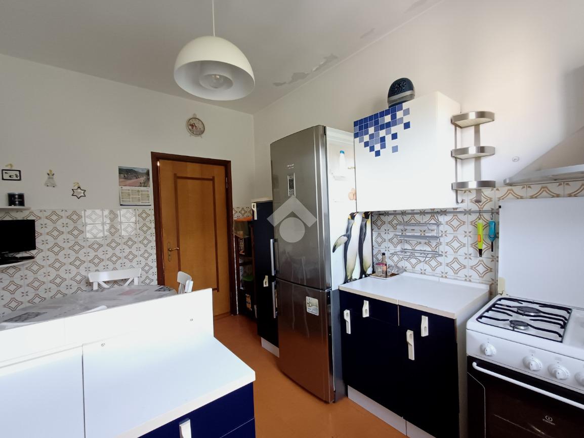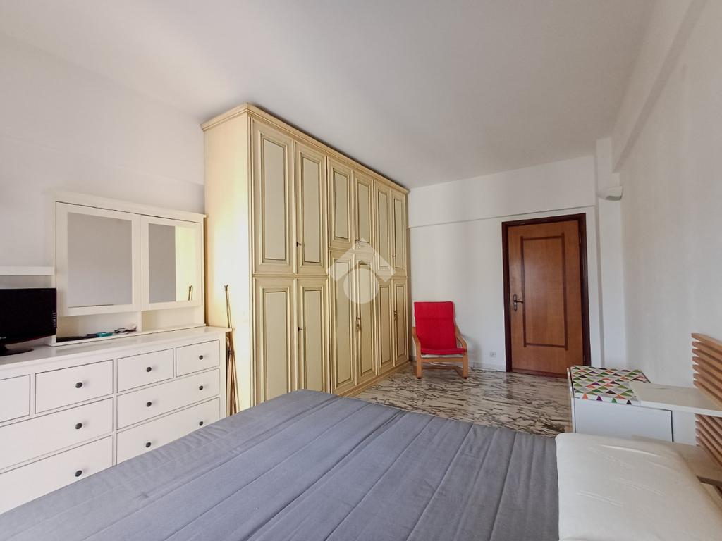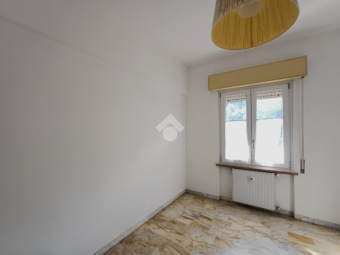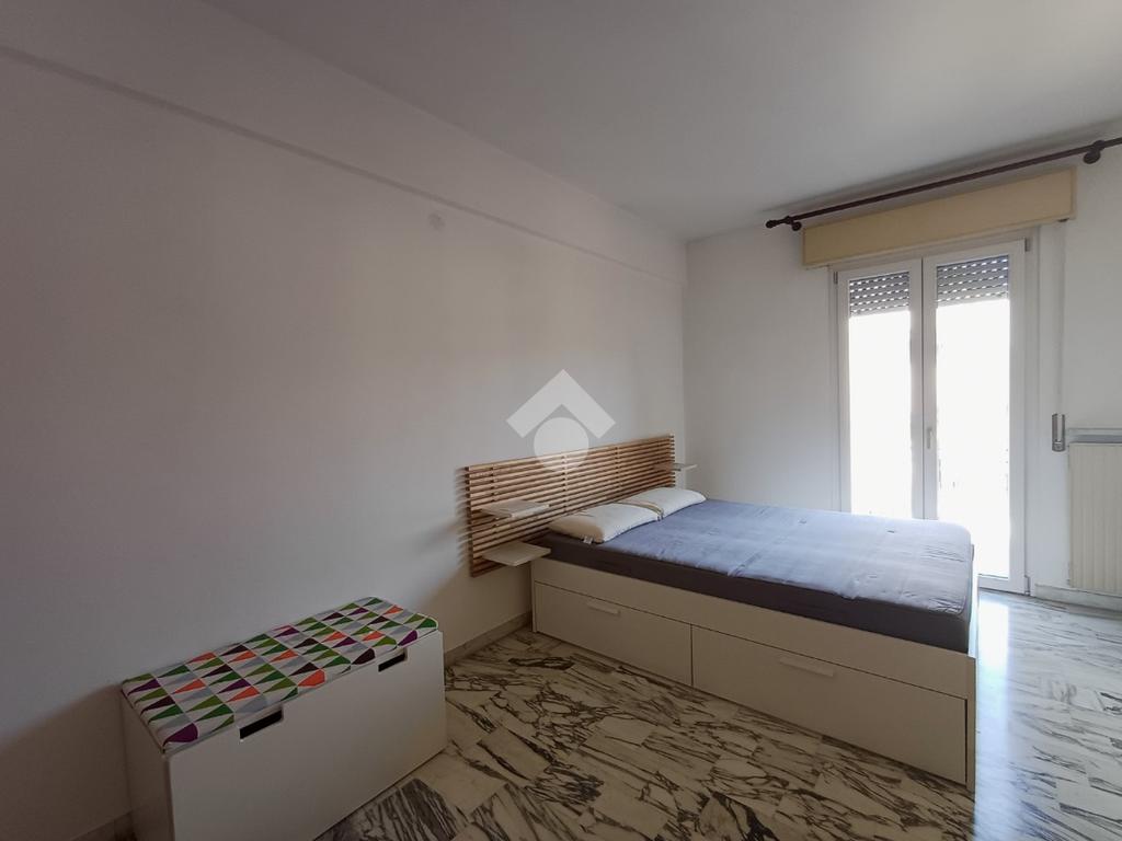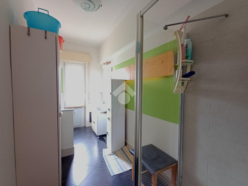 Tra due camere è posizionato il bagno dotato di finestra e box doccia. Internamente in buonissime condizioni, l'immobile è dotato di infissi in alluminio doppio vetro e pavimento in parquet nella prima camera matrimoniale e graniglia alla genovese (tipo marmo) nelle altre stanze.