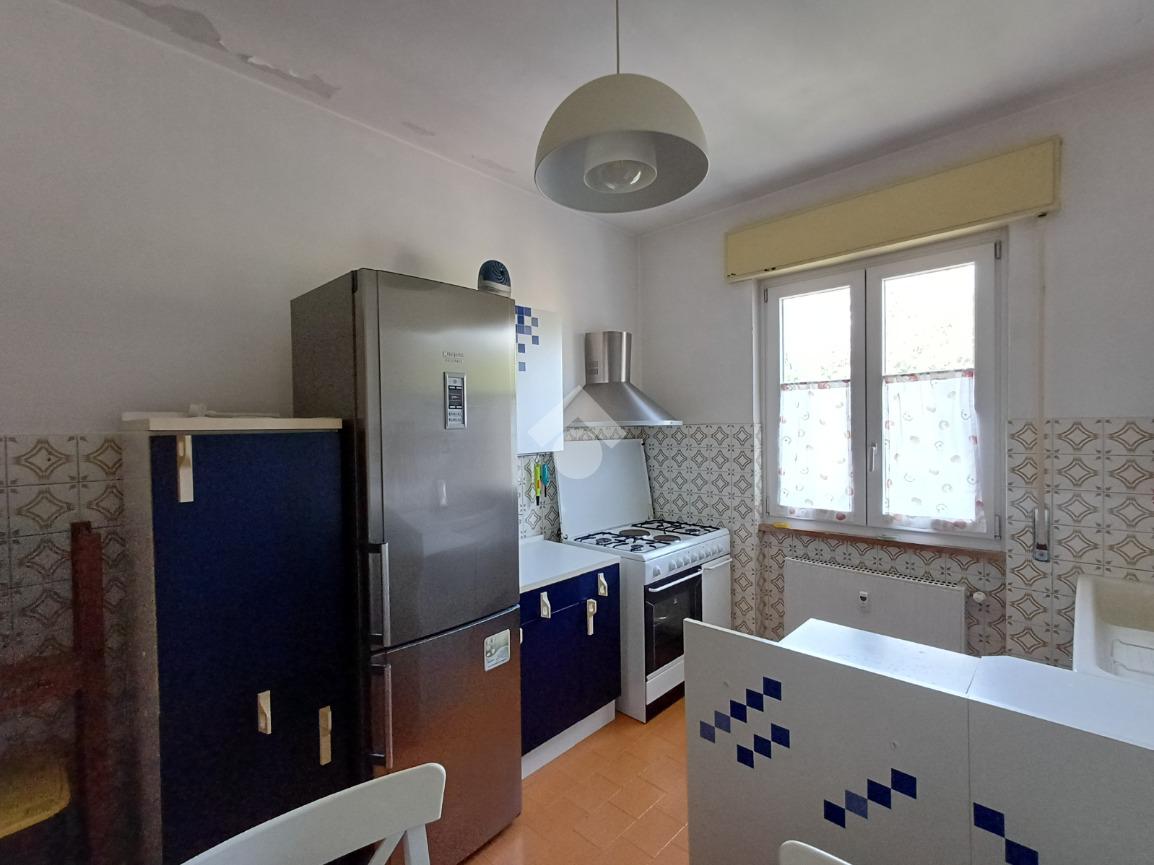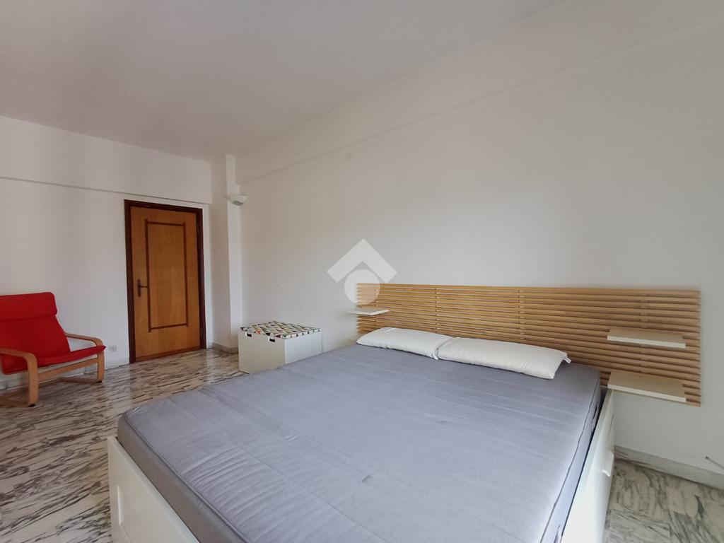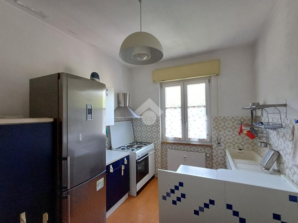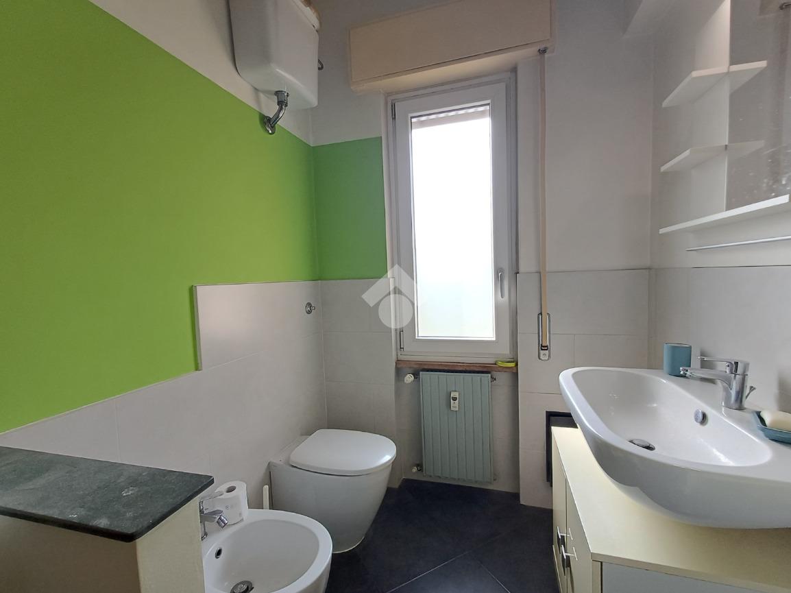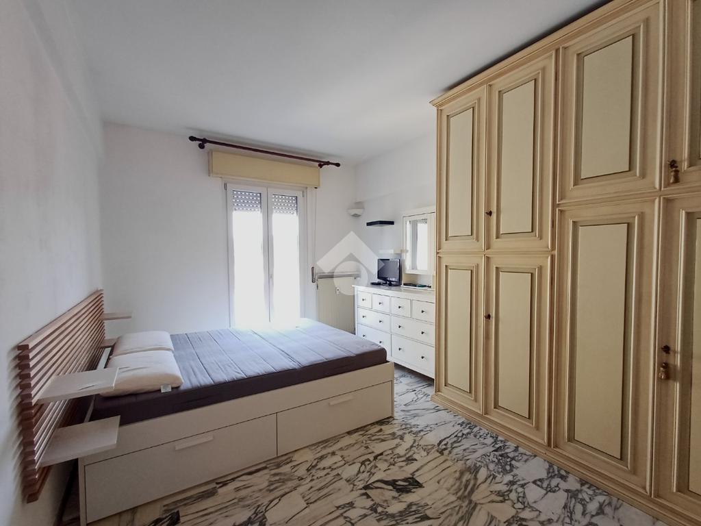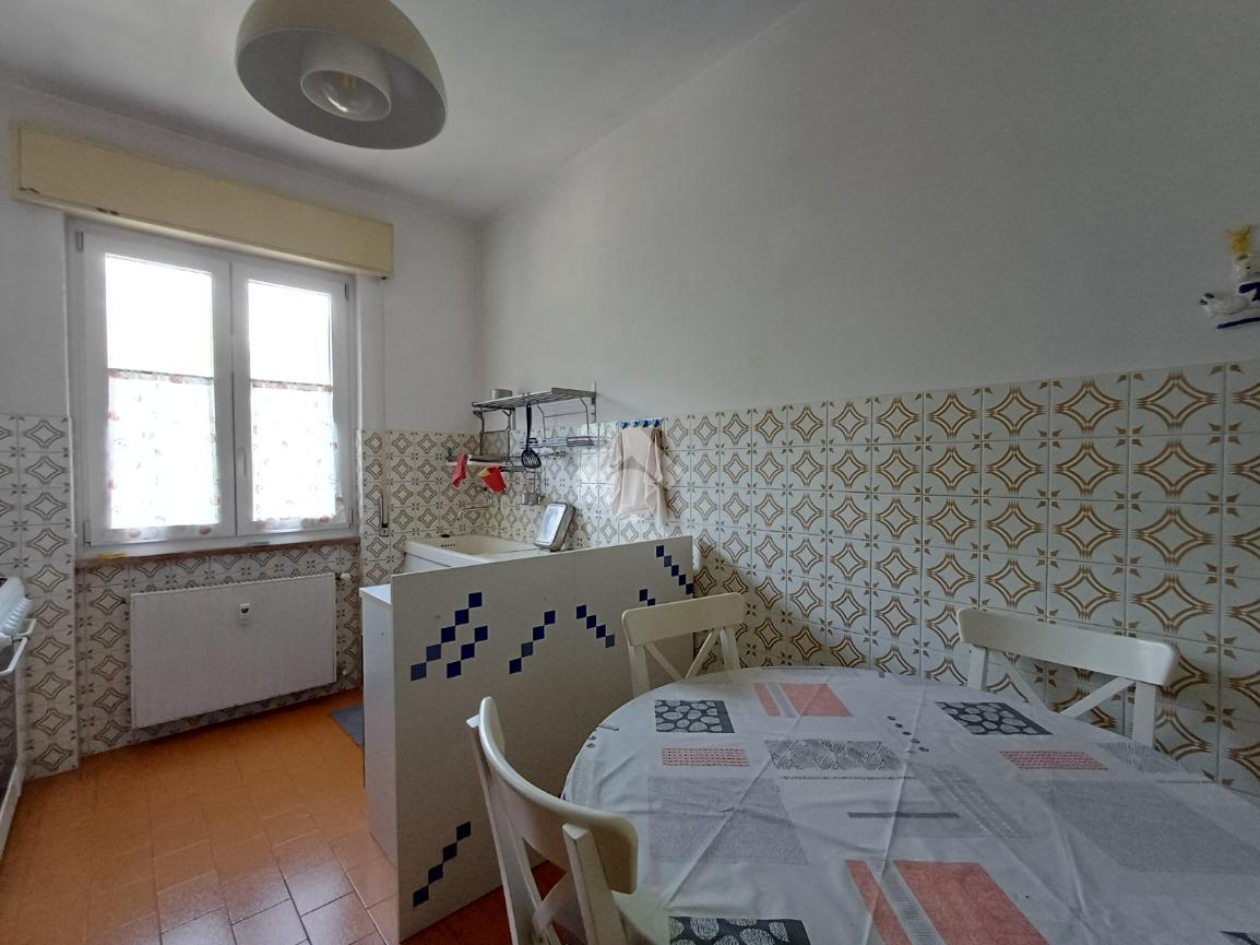 Tra due camere è posizionato il bagno dotato di finestra e box doccia. Internamente in buonissime condizioni, l'immobile è dotato di infissi in alluminio doppio vetro e pavimento in parquet nella prima camera matrimoniale e graniglia alla genovese (tipo marmo) nelle altre stanze.