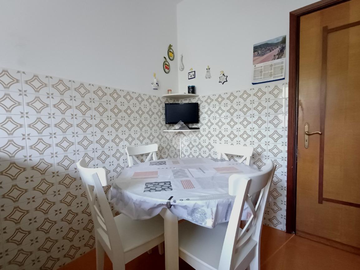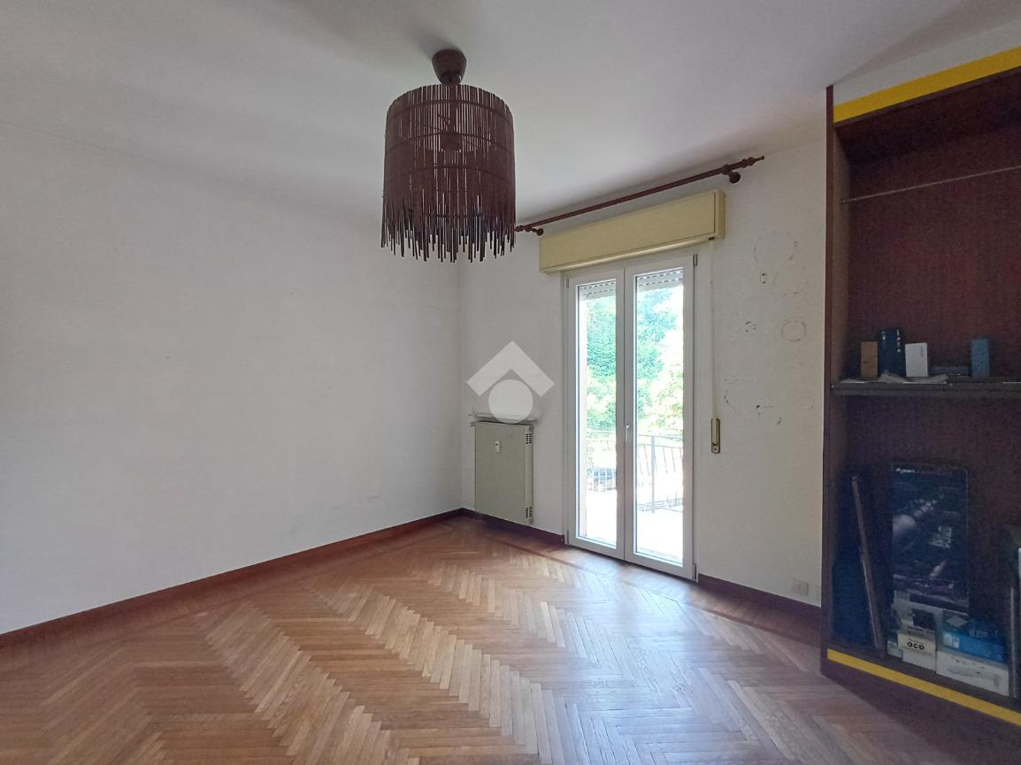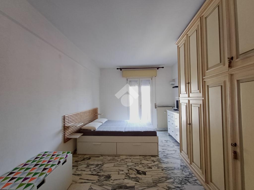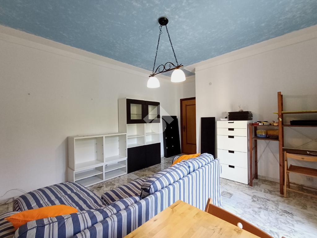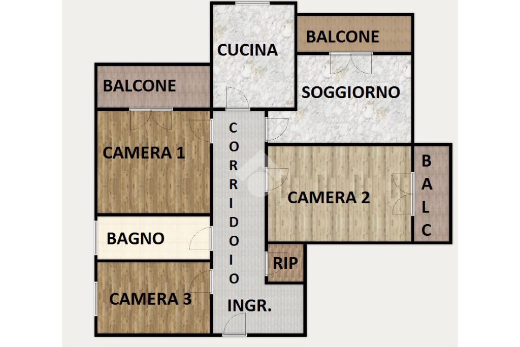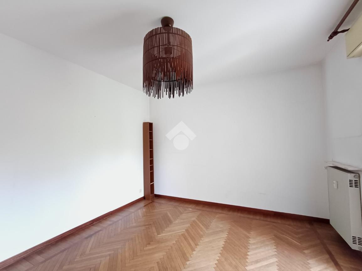 Tra due camere è posizionato il bagno dotato di finestra e box doccia. Internamente in buonissime condizioni, l'immobile è dotato di infissi in alluminio doppio vetro e pavimento in parquet nella prima camera matrimoniale e graniglia alla genovese (tipo marmo) nelle altre stanze.