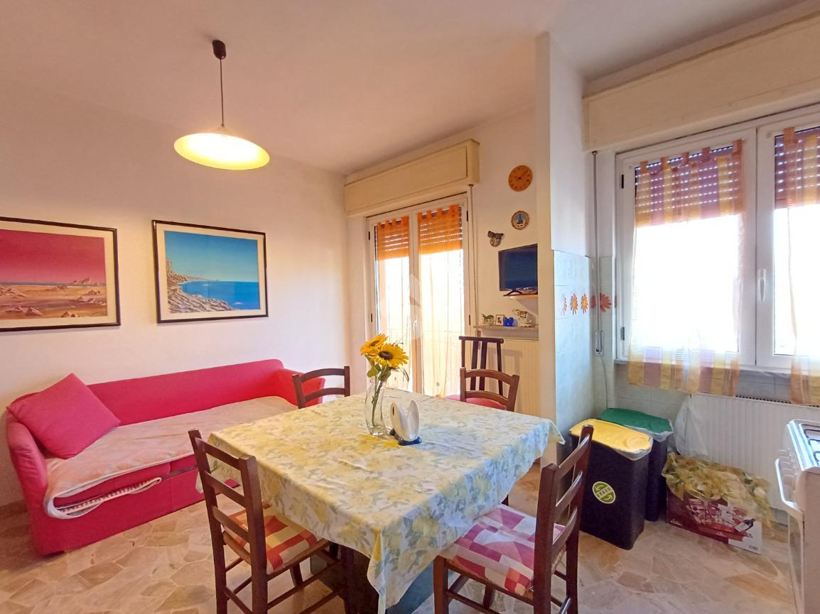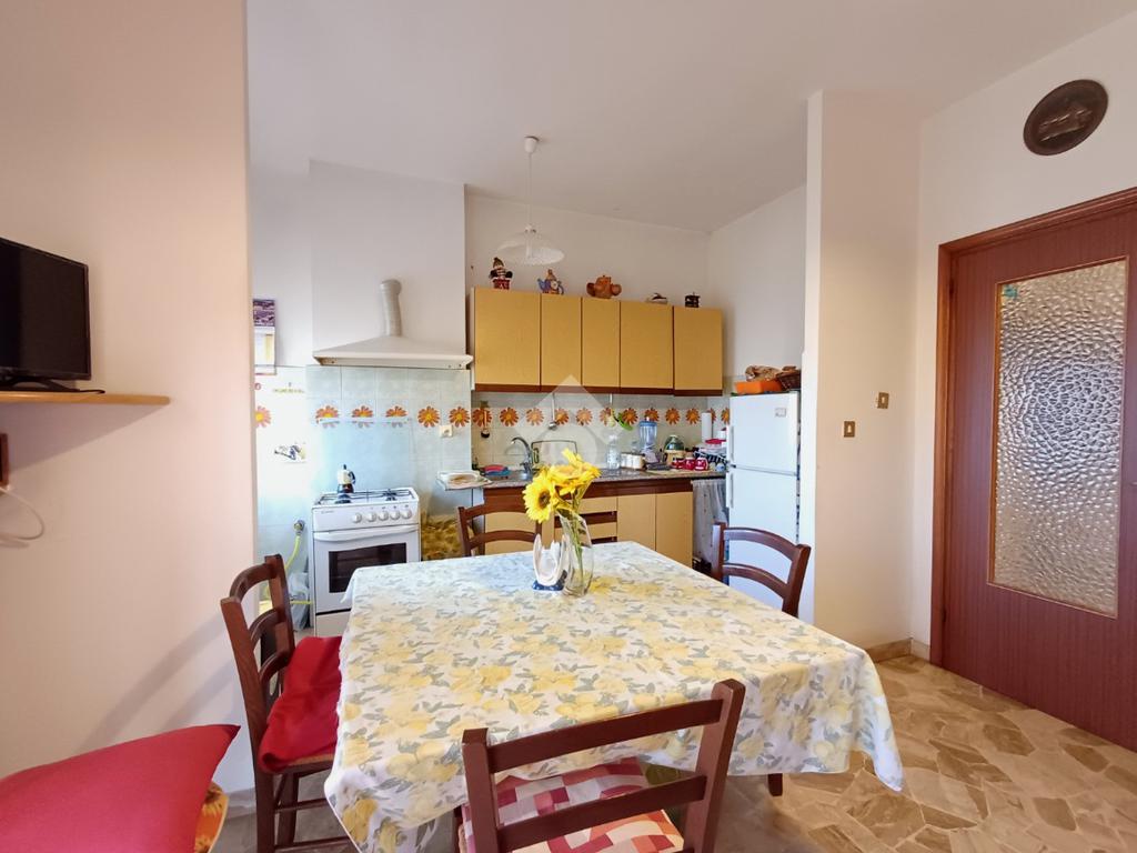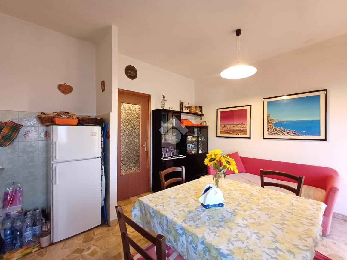 La zona giorno è composta in un unica soluzione da angolo cottura aperto in stile 'open space' sul tinello, attualmente sfruttato come sala da pranzo e come soggiorno.