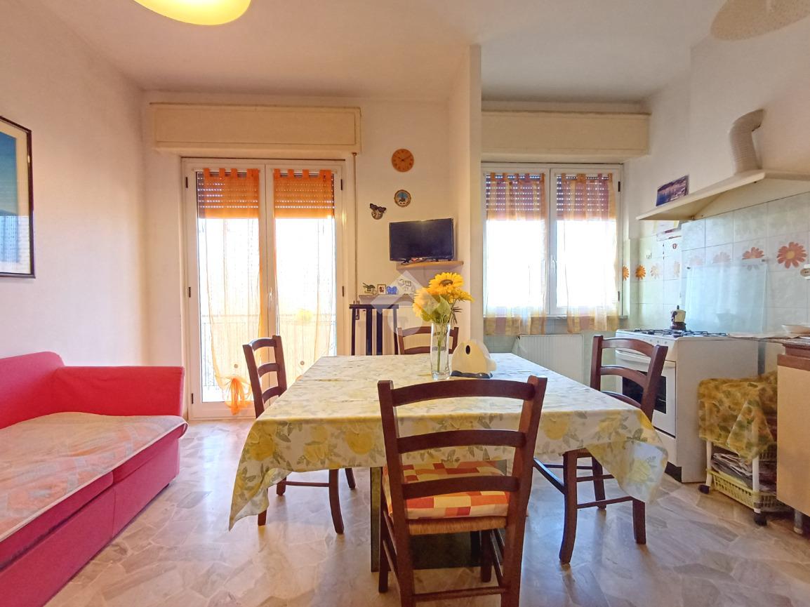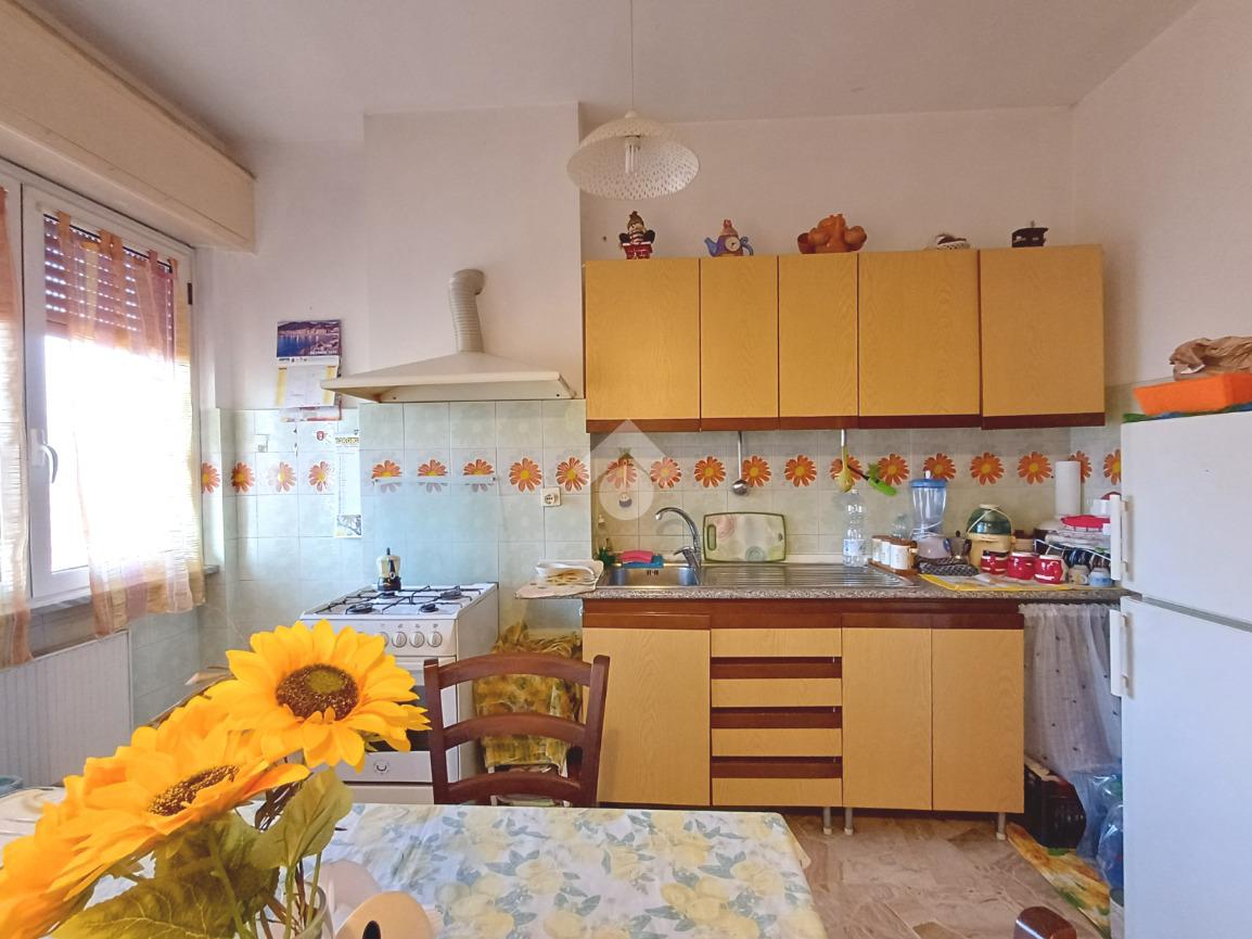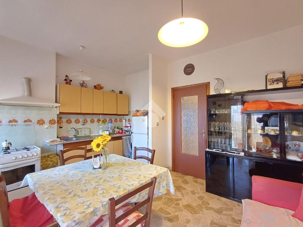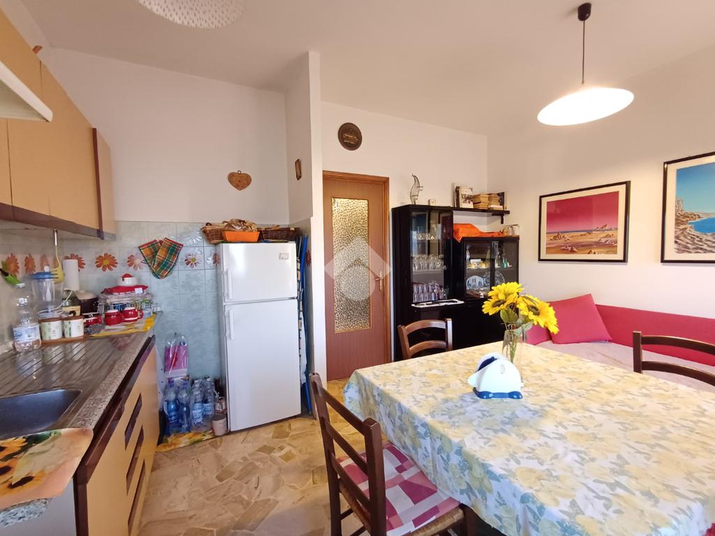 La zona giorno è composta in un unica soluzione da angolo cottura aperto in stile 'open space' sul tinello, attualmente sfruttato come sala da pranzo e come soggiorno.