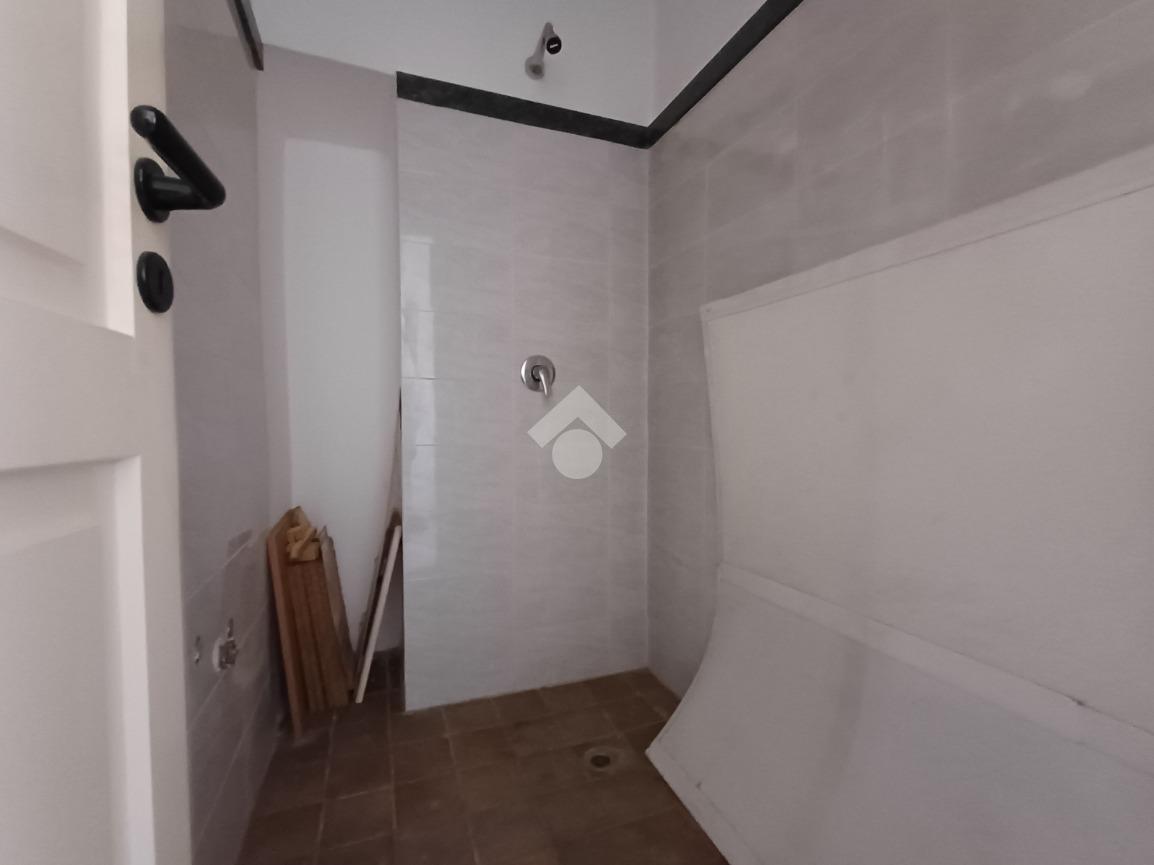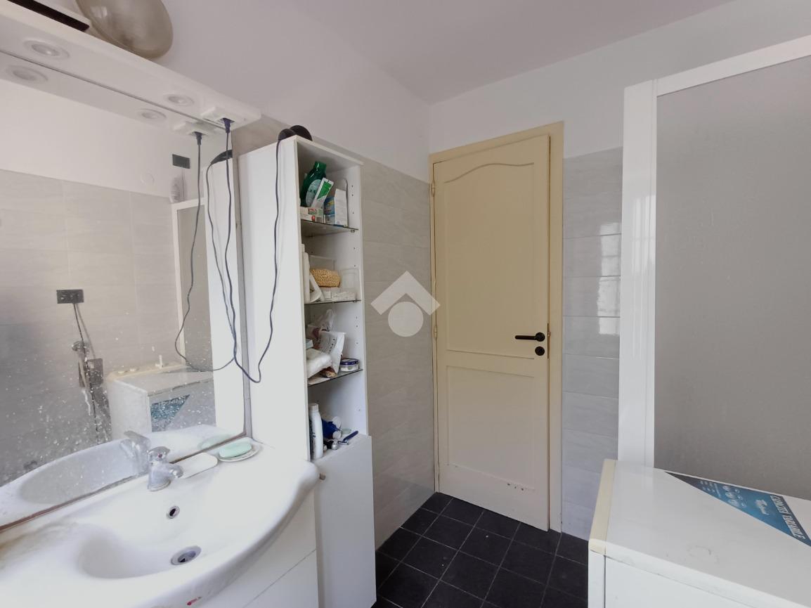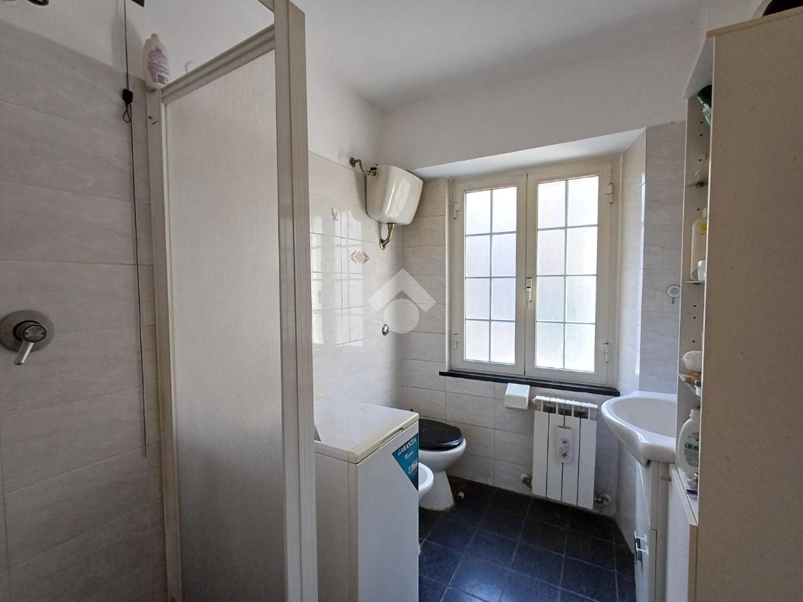 Al centro dell'abitazione è situato il bagno dotato di finestra e box doccia.