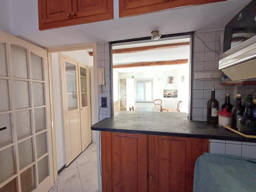 Da un lato troviamo la zona giorno composta da un angolo cottura, aperto tramite caratteristico muretto con apertura a vista (simil finestra) sull'ampio soggiorno.