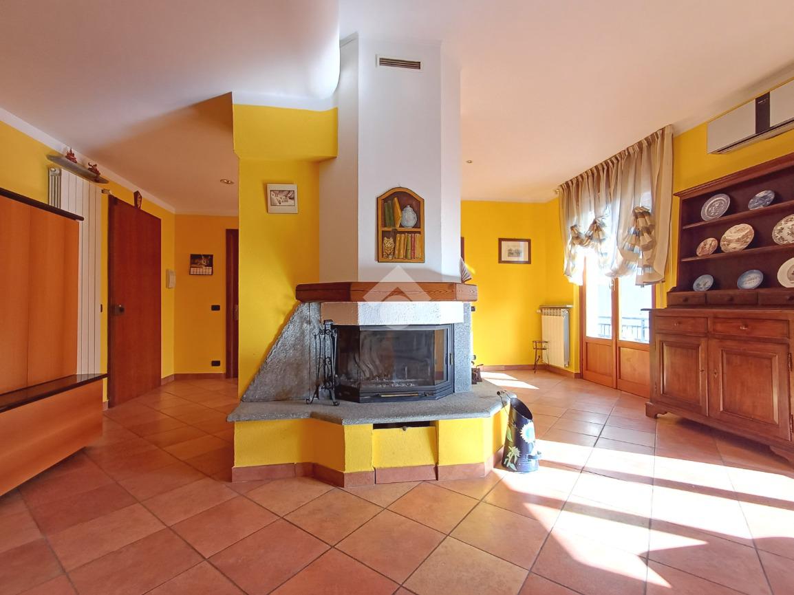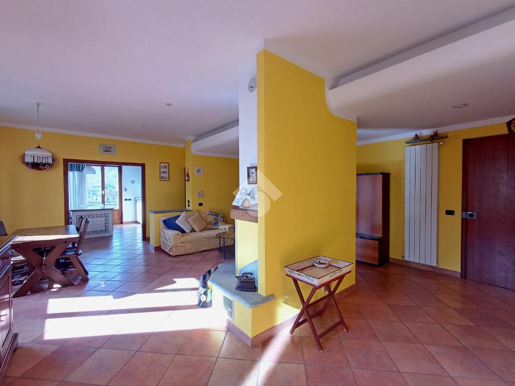 La scala interna conduce alla prima parte abitativa, totalmente ristrutturata e così disposta: all' ingresso ci ritroviamo nel grande salone, dotato di piccolo balcone e tavolo da pranzo. Al centro è presente un camino in muratura, dotato di bocchette che, raggiungendo tutti gli ambienti della casa, permettono di alternare o di sostituire il riscaldamento a metano.