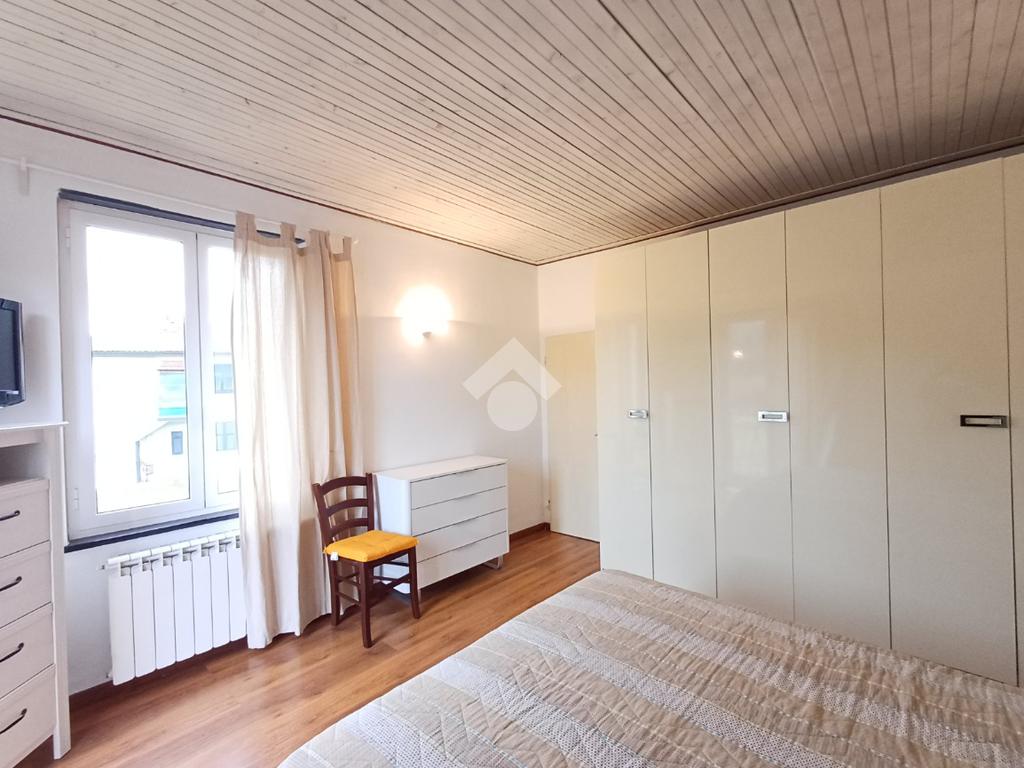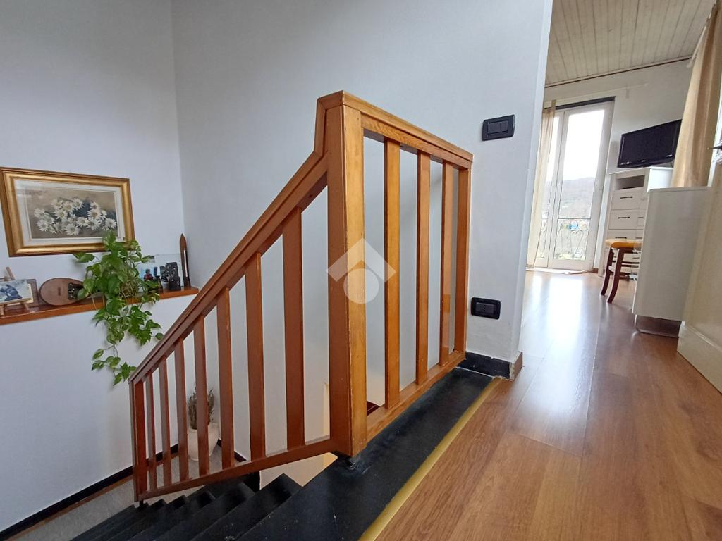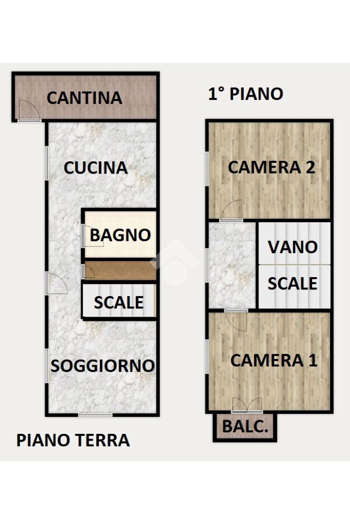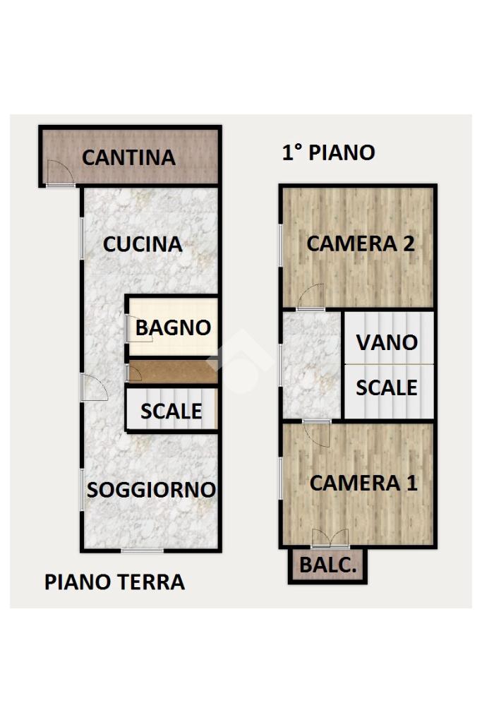 Tra i due ambienti è posizionata una scala (con adiacente ripostiglio sottoscala) che conduce al piano superiore ed alla zona notte composta da due ampie camere matrimoniali; da una delle due camere è possibile accedere, tramite porta-finestra, al balcone con affaccio sul giardino sottostante.