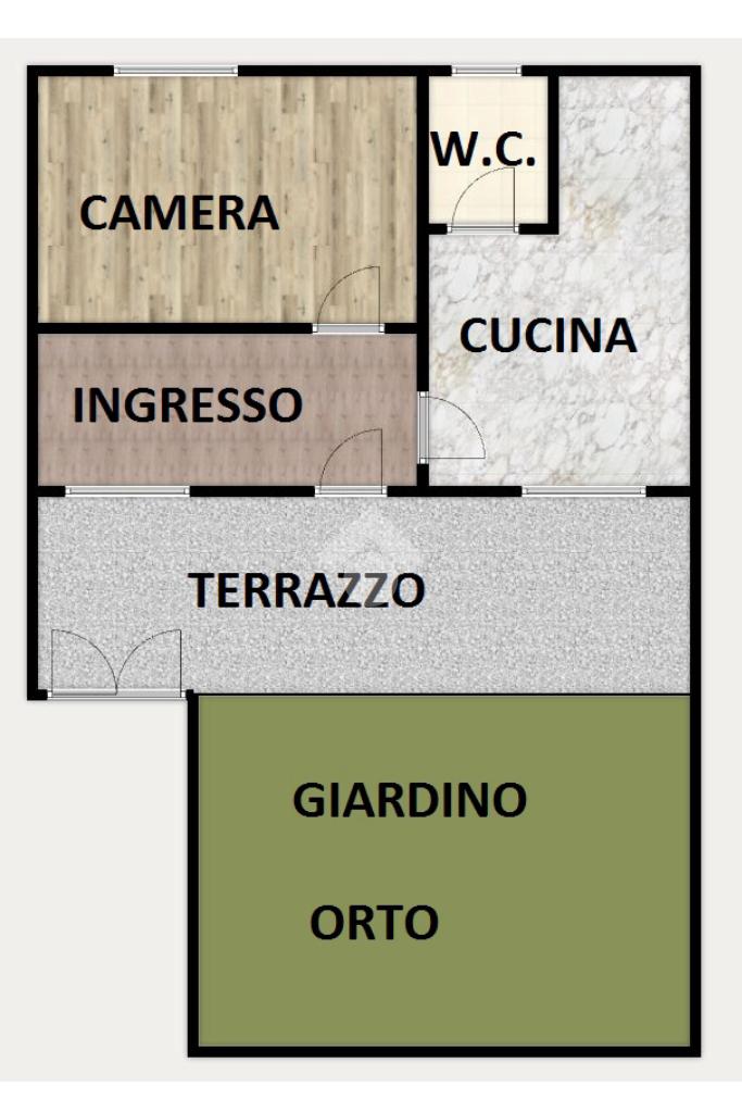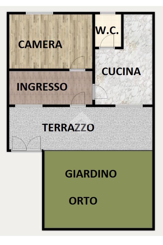 Adiacente ad esso troviamo una cucina abitabile, composta da un angolo cottura e spazio per tavolo da pranzo. Dalla cucina si accede al bagno dotato di finestrella e box doccia.